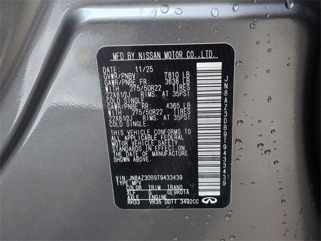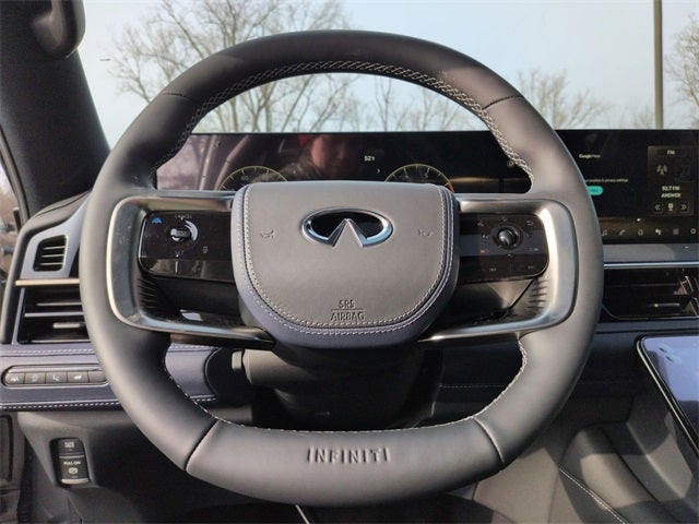 Check out this stunning-looking 2026 INFINITI QX80 with the following amenities Sport Exterior Package (Black Roof Rail Crossbars and Dark Chrome Rear Bumper Protector), Apple CarPlay/Android Auto, Emergency communication system: INFINITI InTouch, Heads-Up Display, Heated and Climate Controlled Front Bucket Seats with Massage, Navigation system: Google Built-in, Power moonroof, Radio: Klipsch Premiere Audio System, Telescoping steering wheel, Unique SPORT Semi-Aniline Leather Seating Surfaces, Wheels: 22 x 8.5J Unique SPORT Alloy, 3rd row seats: bench, 4-Wheel Disc Brakes, ABS brakes, Adaptive suspension, Air Conditioning, Alloy wheels, AM/FM radio: SiriusXM with 360L, Anti-whiplash front head restraints, Audio memory, Auto High-beam Headlights, Auto tilt-away steering wheel, Auto-dimming door mirrors, Auto-dimming Rear-View mirror, Auto-leveling suspension, Automatic temperature control, Brake assist, Compass, Delay-off headlights, Driver door bin, Driver vanity mirror, Dual front impact airbags, Dual front side impact airbags, Electronic Stability Control, Four wheel independent suspension, Front anti-roll bar, Front Bucket Seats, Front Center Armrest, Front dual zone A/C, Front reading lights, Fully automatic headlights, Garage door transmitter: HomeLink, Genuine wood dashboard insert, Genuine wood door panel insert, Heated door mirrors, Heated front seats, Heated rear seats, Heated steering wheel, HVAC memory, Illuminated entry, Knee airbag, Leather steering wheel, Low tire pressure warning, Memory seat, Occupant sensing airbag, Outside temperature display, Overhead airbag, Overhead console, Panic alarm, Passenger door bin, Passenger vanity mirror, Power door mirrors, Power driver seat, Power Liftgate, Power passenger seat, Power steering, Power windows, Radio data system, Rain sensing wipers, Rear air conditioning, Rear anti-roll bar, Rear reading lights, Rear seat center armrest, Rear window defroster, Rear window wiper, Reclining 3rd row seat, Remote keyless entry, Security system, Soft-Sided Cargo Cooler, Speed control, Speed-sensing steering, Splash Guards, Split folding rear seat, Spoiler, Steering wheel memory, Steering wheel mounted audio controls, Tachometer, Tilt steering wheel, Traction control, Trip computer, Turn signal indicator mirrors, Two-Tone Premium Paint, Variably intermittent wipers, Ventilated front seats, and Ventilated rear seats.